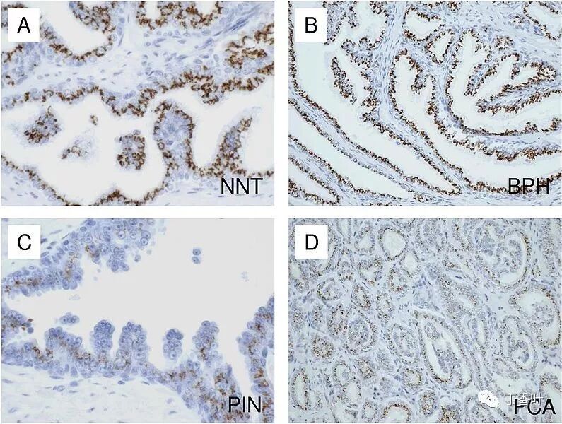 显微镜检查不同类型的前列腺组织(用免疫组织化学技术染色):A。正常(非肿瘤)前列腺组织(NNT)。B.良性前列腺增生。C.高级前列腺上皮内瘤变(PIN)。D.前列腺腺癌(PCA)。