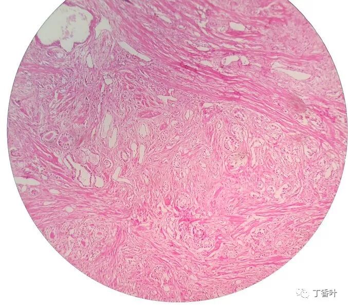 显微照片显示经尿道前列腺切除术(TURP)的前列腺结节性增生(左中心)。H&E染色。